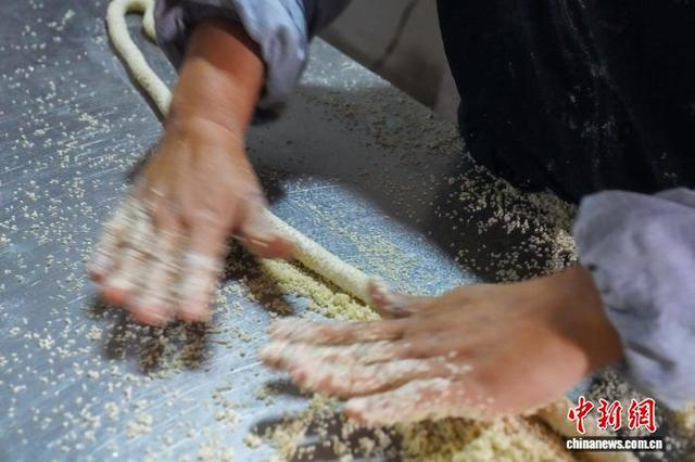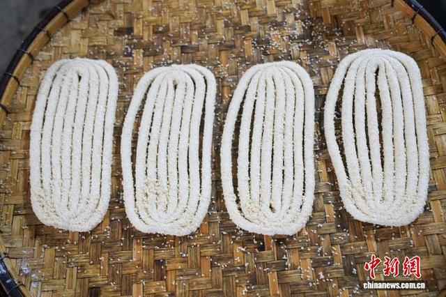 图为工人通过揉搓把芝麻粘在“草鞋”粿条上。王以照 摄