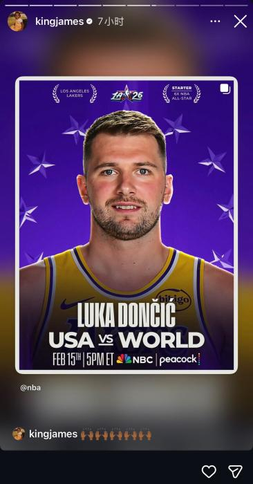 在全明星首发阵容公布后,詹姆斯在社交媒体转发祝贺队友东契奇入选。