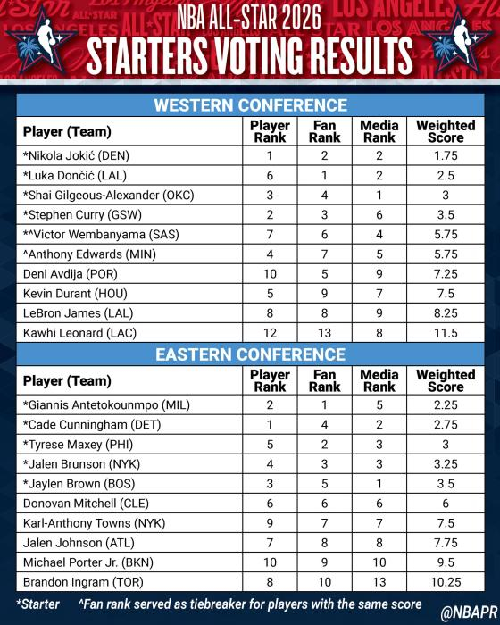 2026年NBA全明星投票结果 图片来源:NBA社交媒体最终,东部首发阵容名单为安特托昆博(雄鹿)、杰伦-布朗(凯尔特人)、布伦森(尼克斯)、坎宁安(活塞)和马克西(76人),西部首发阵容名单为东契奇(湖人)、库里(勇士)、亚历山大(雷霆)、约基奇(掘金)和文班亚马(马刺)。由于赛制改变,他们可能会重新搭配。