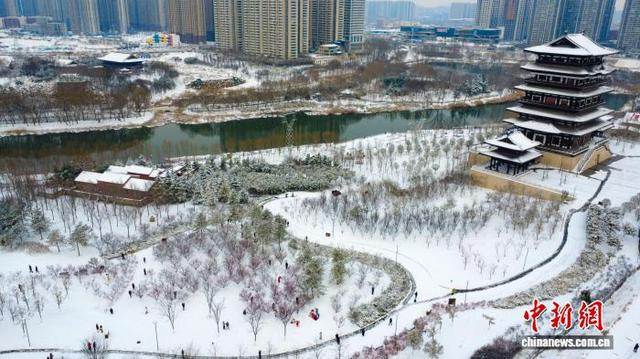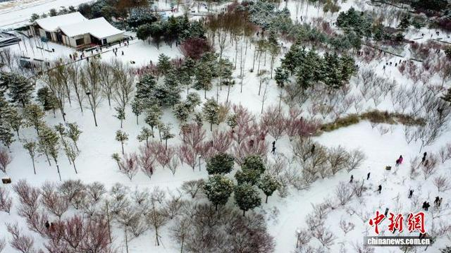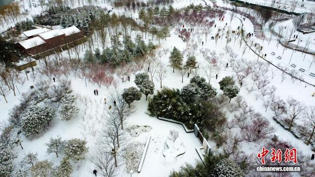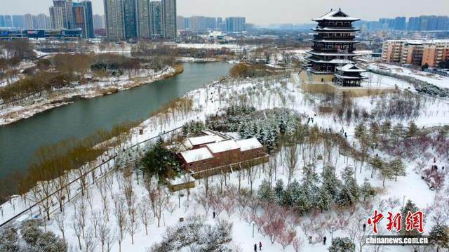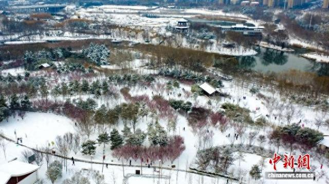 1月20日,河南郑州,雪后初霁,西流湖公园银装素裹,湖面、林木与远景交融,宛如一幅水墨画卷。(无人机照片) 中新社记者 范晓恒 摄