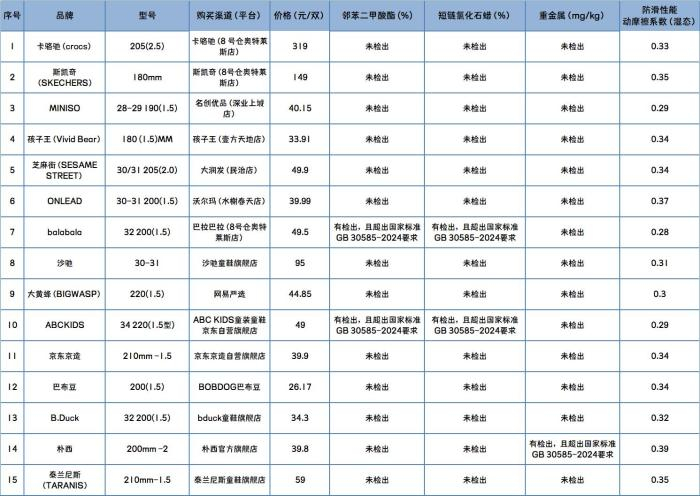 深圳市消费者委员会近日发布的15款儿童洞洞鞋比较试验结果显示,balabala、ABCKIDS鞋花部位被检出邻苯二甲酸酯、短链氯化石蜡含量超过国家标准GB 30585-2024《童鞋安全技术规范》相关要求,朴西样品鞋花部位被检出重金属铅含量超过国家标准。