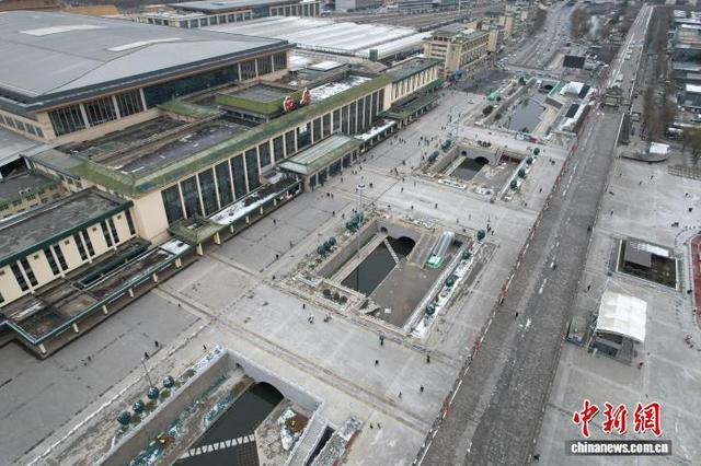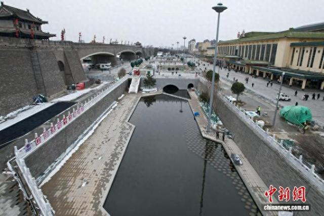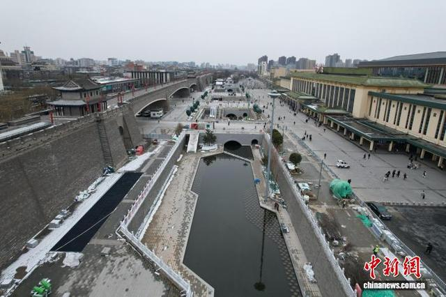1月20日,陕西西安,西安市护城河及环城公园(西门-北门-东门)综合改造工程(二期)火车站段项目通水,打通了环城水系最后一段“盲肠”。图为护城河火车站段。(无人机照片)中新社记者 张远 摄