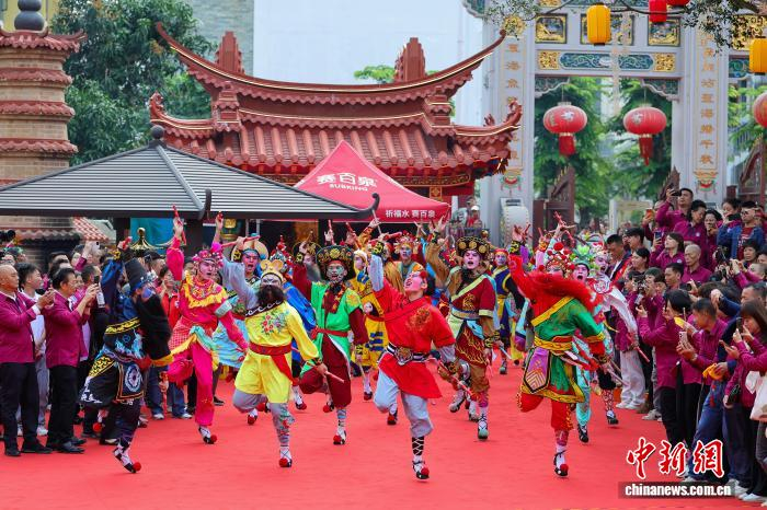 1月20日,兴潮天后宫重光三年庆典在海口举办,妈祖敬仰者谨循礼制,向妈祖行庄重的三献礼。 中新网记者 骆云飞 摄现场,国家级非遗英歌舞表演点燃了全场气氛。舞者们穿着特制服装,手执双短棒,踏着铿锵鼓点,迈着矫健舞步,独特的风格、紧凑的节奏和强烈的动感引得观众驻足喝彩。此外,精彩的潮剧团演出让人目不转睛,高低有致的唱腔让观众沉浸在潮汕文化的独特韵味中。
