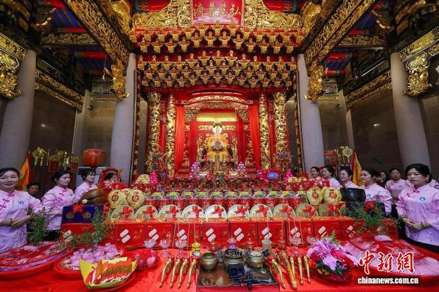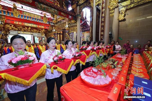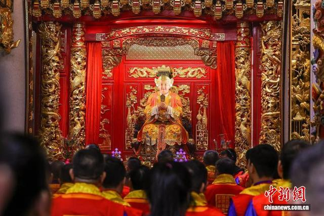 1月20日,农历十二月初二,兴潮天后宫重光三年庆典在海南海口举办,前来祈福的妈祖信众络绎不绝,宫庙香火旺盛。图为妈祖敬仰者向妈祖行庄重的三献礼。中新社记者 骆云飞 摄