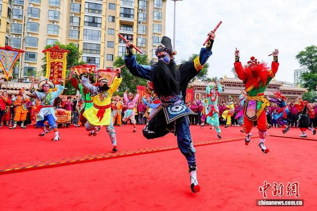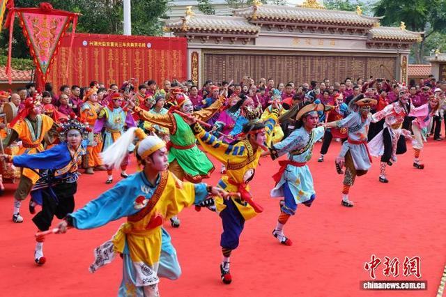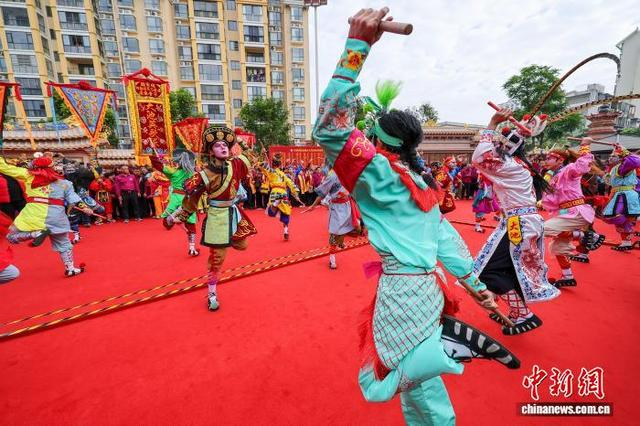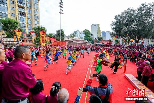 1月20日,农历十二月初二,兴潮天后宫重光三年庆典在海南海口举办,前来祈福的妈祖信众络绎不绝,宫庙香火旺盛。图为国家级非遗英歌舞表演亮相活动现场。中新社记者 骆云飞 摄