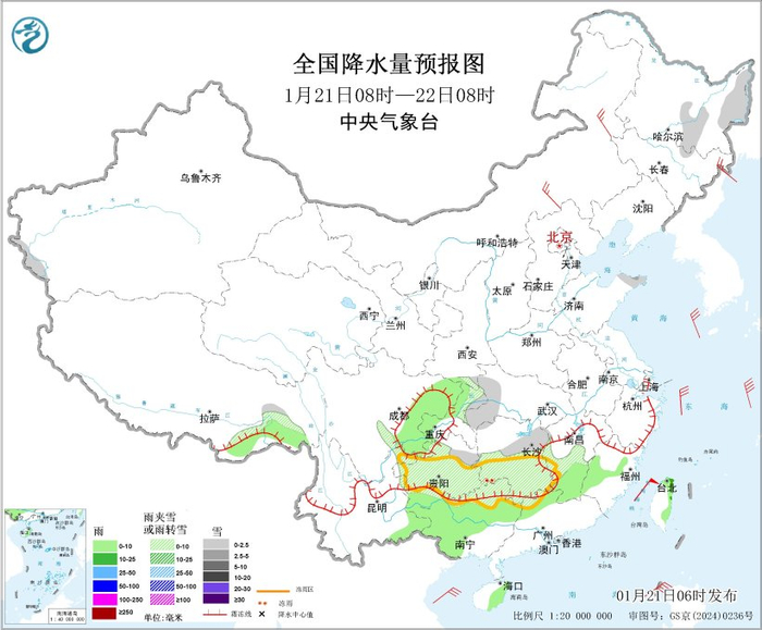 中新网1月21日电 据中央气象台网站消息,昨日,江淮、江南、江汉等地出现降雪或雨夹雪天气,湖南、贵州出现冻雨,湖南出现强降温。预计21日,湖南、贵州、江西、广西等地有雨雪天气,部分地区伴有冻雨,关注对交通、能源供应、人体健康、城市运行、农业生产等的影响。