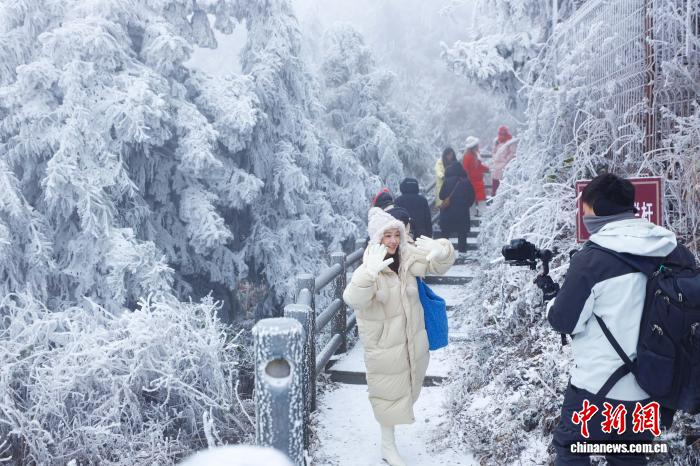 在山顶老公路旁的雪亭周边,是雾凇凝结最为密集之处。游客们或驻足拍照,或轻声赞叹,在南国的冰雪世界中流连忘返。