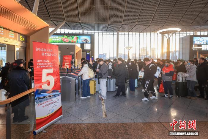 1月22日,旅客在北京朝阳站乘车。记者 贾天勇 摄五年前的2021年1月22日9时16分,北京朝阳开往沈阳北的G913次列车鸣笛发车,标志着“十四五”时期京津冀区域内首条开通运营的高铁线路——京哈高铁北京至承德段开通。至此,全长1198公里的京哈高铁实现全线开通运营。