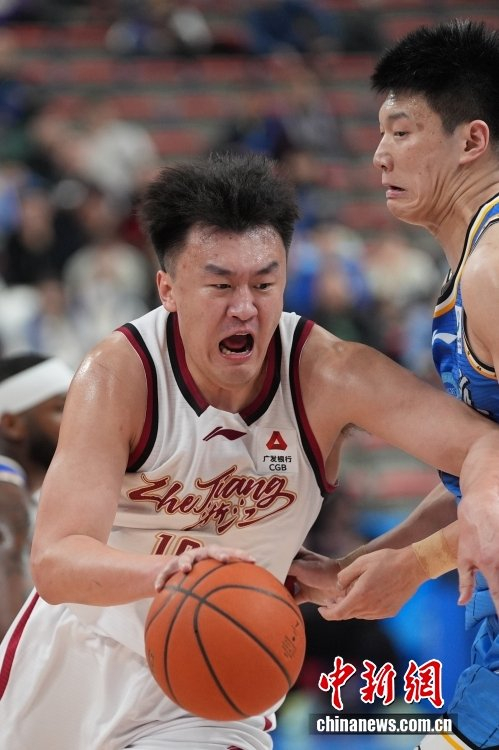 1月22日,在北京首钢园冰球馆举行的2025-2026中国男子篮球职业联赛(CBA)常规赛比赛中,北京北汽队主场79比73战胜浙江稠州金租队。图为浙江稠州金租队刘泽一(白衣)带球突破。中新社记者 张祥毅 摄