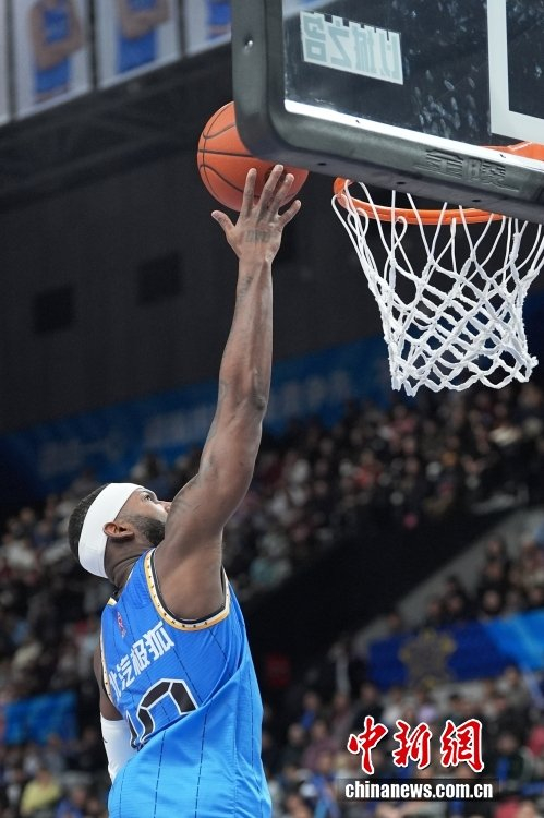 1月22日,在北京首钢园冰球馆举行的2025-2026中国男子篮球职业联赛(CBA)常规赛比赛中,北京北汽队主场79比73战胜浙江稠州金租队。图为北京北汽队杰曼(蓝衣)上篮。中新社记者 张祥毅 摄