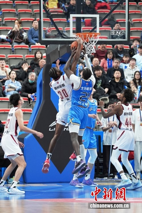 1月22日,在北京首钢园冰球馆举行的2025-2026中国男子篮球职业联赛(CBA)常规赛比赛中,北京北汽队主场79比73战胜浙江稠州金租队。图为双方队员拼抢。中新社记者 张祥毅 摄