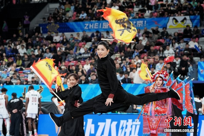 1月22日,在北京首钢园冰球馆举行的2025-2026中国男子篮球职业联赛(CBA)常规赛比赛中,北京北汽队主场79比73战胜浙江稠州金租队。图为啦啦队的国风开场表演。中新社记者 张祥毅 摄