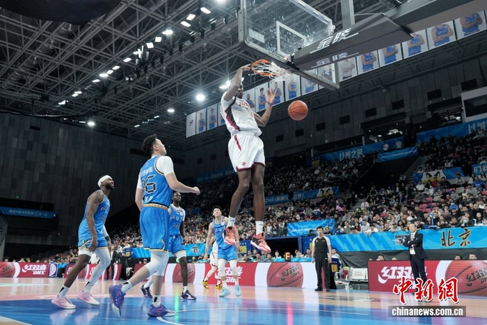 1月22日,在北京首钢园冰球馆举行的2025-2026中国男子篮球职业联赛(CBA)常规赛比赛中,北京北汽队主场79比73战胜浙江稠州金租队。图为浙江稠州金租队琼斯(白衣)扣篮。中新社记者 张祥毅 摄
