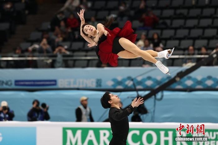 1月22日,2026年国际滑联四大洲花样滑冰锦标赛在北京开赛。中国组合隋文静(上)、韩聪在双人滑短节目比赛中获得76.02分。中新社记者 蒋启明 摄