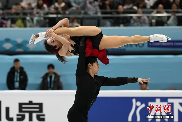 1月22日,2026年国际滑联四大洲花样滑冰锦标赛在北京开赛。中国组合张嘉轩(左)、黄一航在双人滑短节目比赛中获得69.05分。中新社记者 蒋启明 摄
