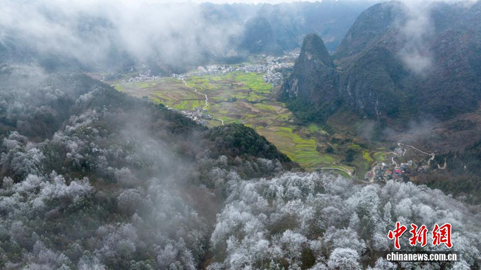 1月22日,受强冷空气影响,广西百色市田林县高海拔山区迎来雾凇景观。树木银装素裹,冰晶在枝叶间凝结成剔透的霜花,与远处云雾缭绕的山峦、山脚下绿意盎然的田园相映成趣,吸引游客前来观赏。图为田林县浪平镇雾凇景观。黄园艺 摄
