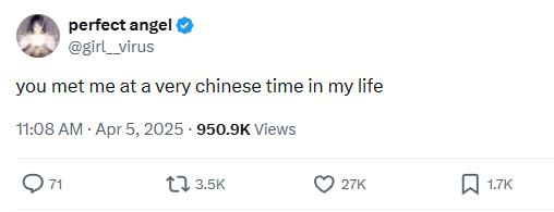2025年4月,一位X网友发布了一条帖子,内容很简单:你在我人生中非常中国化的一个时期遇到我了。