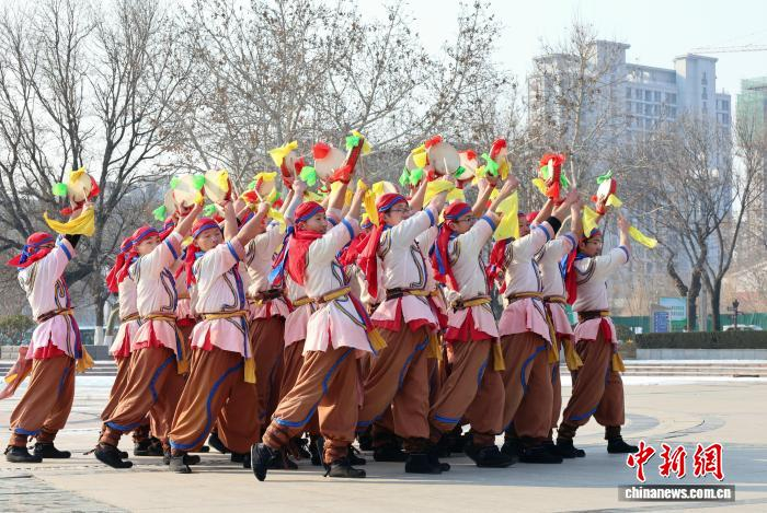 1月23日,山东济南,济南新技术应用学校的学生在公园表演商河鼓子秧歌改编而成的《大河之声》。据了解,商河鼓子秧歌是中国国家级非物质文化遗产代表性项目,有两千多年传承历史,位列“山东三大秧歌”之首。赵晓 摄