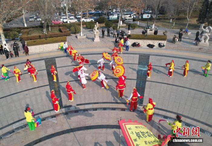 1月23日,山东济南,商河滨河秧歌艺术团队员身着传统服饰,伴着鼓点,在公园表演鼓子秧歌。据了解,商河鼓子秧歌是中国国家级非物质文化遗产代表性项目,有两千多年传承历史,位列“山东三大秧歌”之首。(无人机照片)祁建月 摄