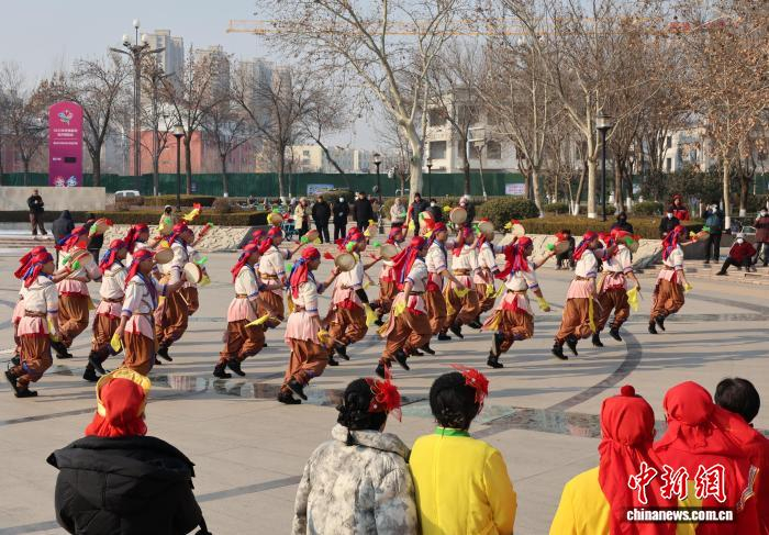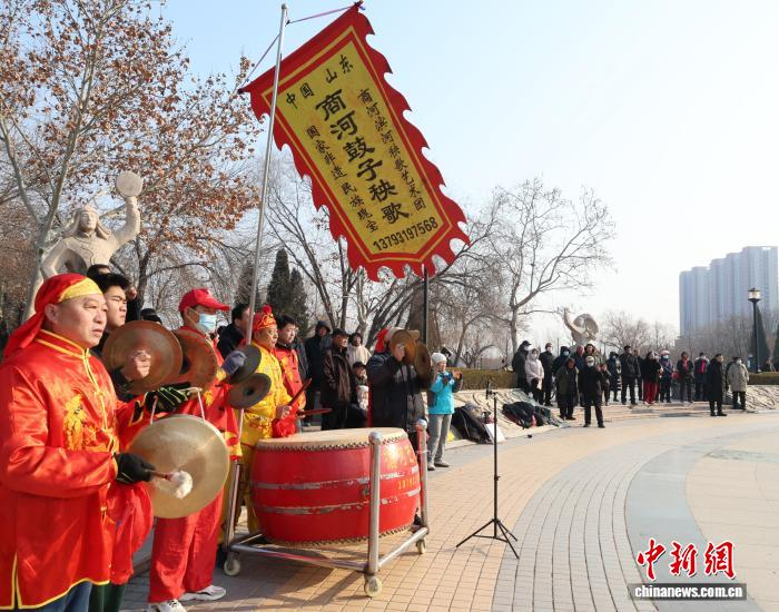 1月23日,山东济南,商河滨河秧歌艺术团队员在公园表演鼓子秧歌,吸引周边民众观看。据了解,商河鼓子秧歌是中国国家级非物质文化遗产代表性项目,有两千多年传承历史,位列“山东三大秧歌”之首。赵晓 摄