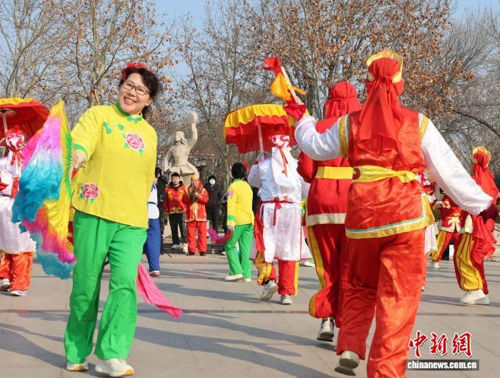 1月23日,山东济南,商河滨河秧歌艺术团队员身着传统服饰,伴着鼓点,在公园表演鼓子秧歌。据了解,商河鼓子秧歌是中国国家级非物质文化遗产代表性项目,有两千多年传承历史,位列“山东三大秧歌”之首。赵晓 摄