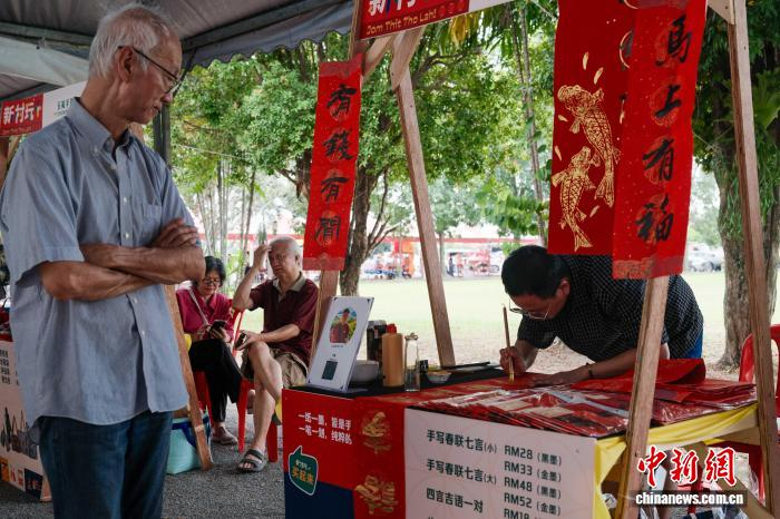 1月25日下午,为期两天的马来西亚雪兰莪州新村节在雪兰莪州巴生市班达马兰华人新村落幕。图为书法家挥春写春联展现新村文化迎新春。中新社记者 陈悦 摄