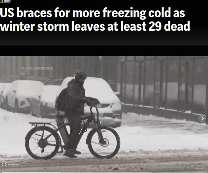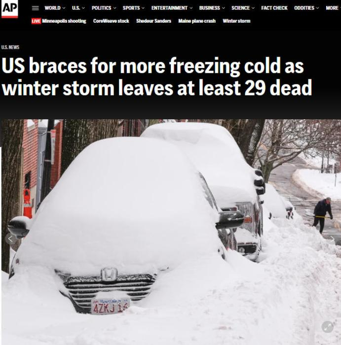 中新网1月27日电 据美联社等美媒报道,近日,一场冬季风暴席卷美国多地,已经造成至少29人死亡。