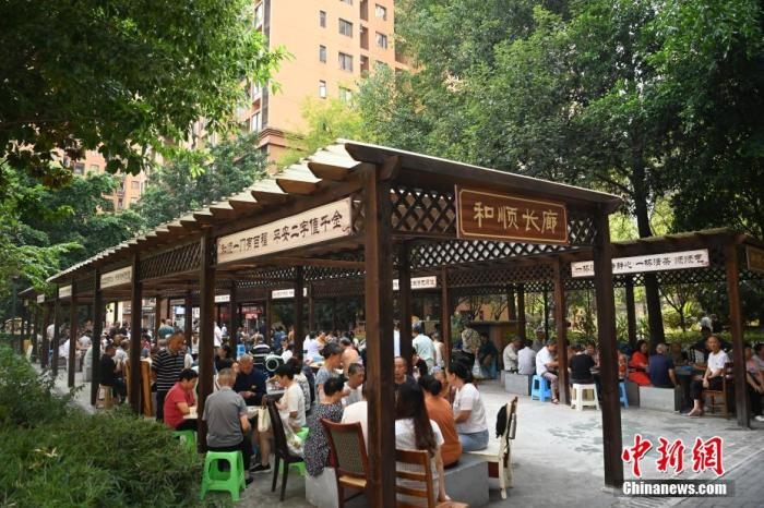 资料图:2024年9月24日,在全国示范性老年友好型社区——重庆市沙坪坝区井口街道美丽阳光家园社区,不少当地老人聚集在小区凉亭下玩扑克、打麻将、下棋、聊天等。中新网记者 陈超 摄