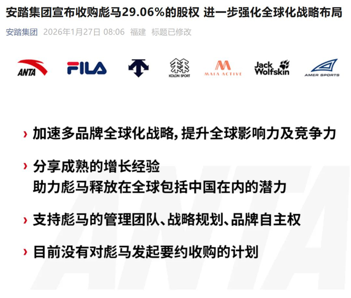 相关公告称,此举是安踏集团深入推进全球化战略的重要一步,将提升其在全球体育用品市场的影响力、知名度以及竞争力。