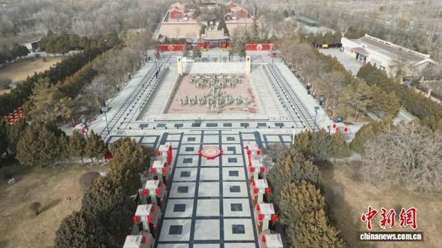 1月27日,作为铜奔马出土地,甘肃省武威市雷台汉墓景区随着春节临近,年味渐浓。据了解,2026年“欢乐春节”吉祥物“骥骥”将在马年春晚亮相,其设计灵感源自铜奔马。在雷台汉墓出土众多文物中最突出的是铸造精致的99件铜车马仪仗俑,艺术价值最高的是铜奔马。图为航拍下的雷台汉墓景区。 戴文昌 摄