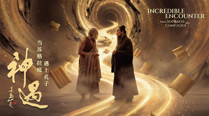 纪录片《神遇:当苏格拉底遇上孔子》海报。 出品方供图《神遇:当苏格拉底遇上孔子》是江苏广电重点打造的“思想的对话”系列纪录片《神遇》首部作品,分上下两集,每集45分钟,全片以4K超高清拍摄,以“科技+叙事”的创新模式,开启人类轴心时代最伟大思想家的跨时空对话。