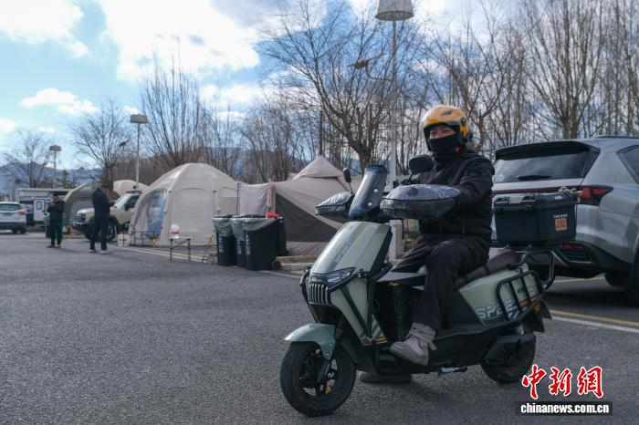 1月25日,拉萨市中华文化公园内,一位户外露营爱好者准备出发去接单送外卖,该营地不少人兼职当外卖员,以支撑自己的户外生活。江飞波 摄