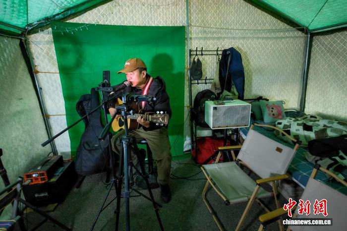 1月26日,拉萨市中华文化公园露营地,来自江苏南京的赵德春在帐篷内弹吉他、唱民谣。江飞波 摄采访时,帐篷区传来吉他伴奏的民谣歌声,歌者叫赵德春,来自江苏南京。他自述几年前公司破产,人生陷入“黑暗时刻”,“2023年春节,我自驾川西格聂南线,夜里通过一处结冰的危险垭口,从垭口有惊无险地通过后,我突然想明白了,人生不能只盯着过去,要有新的生活。”他说,此后自己重拾信心,在金沙江畔巴塘开了一家咖啡厅,2025年4月,咖啡厅转手,自驾进藏到达拉萨。