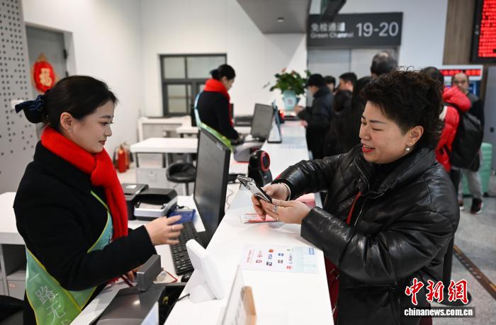 1月27日,郑晓秋落地杭州机场后办理车票。郑晓秋十多年前离开青田前往葡萄牙,如今在当地经商。中新社记者 王刚 摄