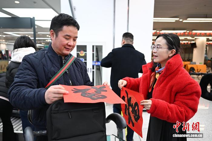 1月27日,浙江省侨联工作人员(右)向返乡的欧洲侨胞送福帖。中新社记者 王刚 摄