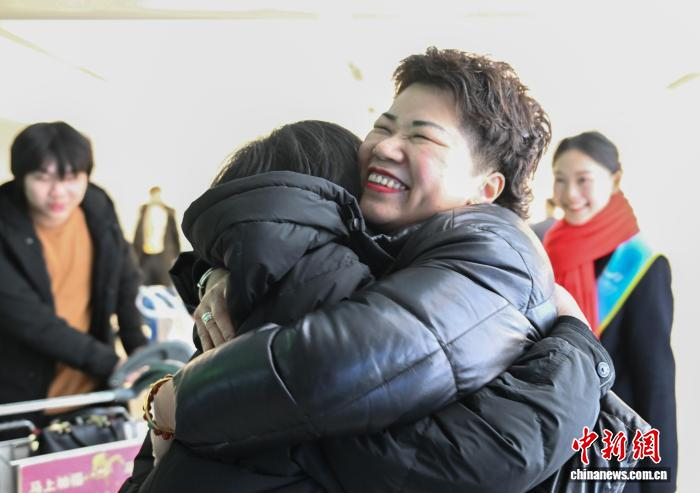 1月27日,葡萄牙华侨郑晓秋(右)在杭州机场偶遇了生活在西班牙的同乡人,并热情拥抱。郑晓秋十多年前离开青田前往葡萄牙,如今在当地经商。中新社记者 王刚 摄