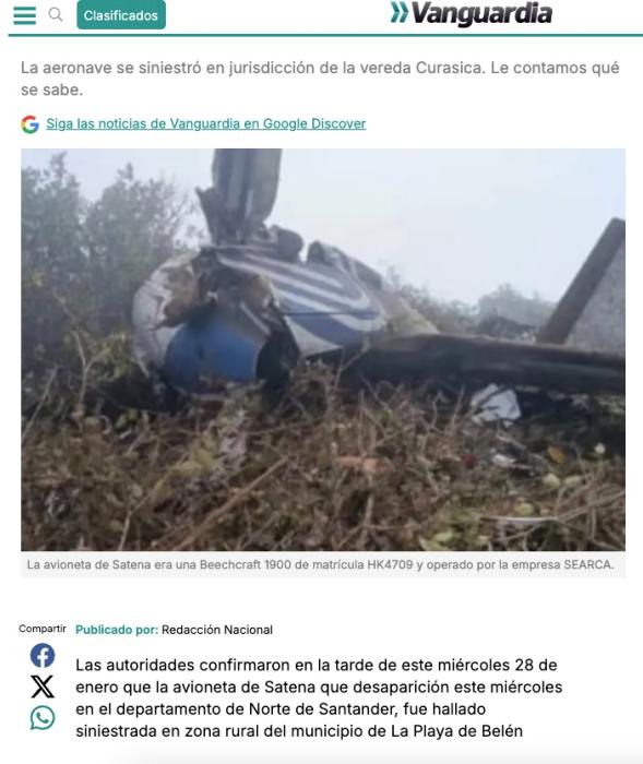 中新网1月29日电 据哥伦比亚媒体报道,哥伦比亚当局当地时间28日下午证实,当天在该国北桑坦德省失踪的一架客机已经坠毁,机上15人全部遇难。