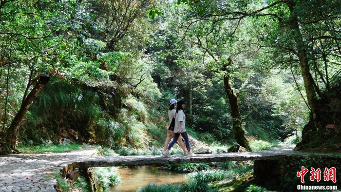 遂昌神龙谷,游客在溪中小桥上行走。遂昌融媒体中心 供图在遂昌欣赏山水之余,也能在群山与湖水之间找到温暖的落脚处。