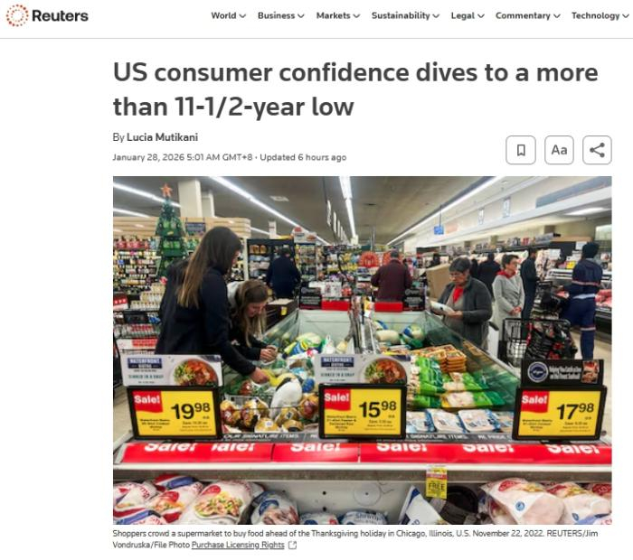 世界大型企业研究会分析指出,在创下逾11年半来新低的背后,是美国民众对疲弱劳动力市场和高物价担忧不断加剧,这可能促使家庭支出更加谨慎。