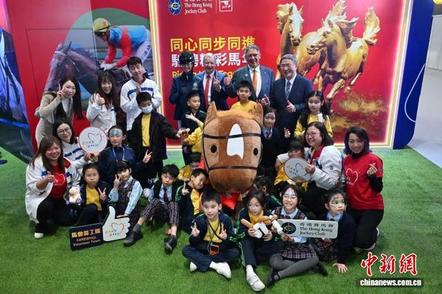 图为香港特区政府政务司副司长卓永兴(后排右一)、香港赛马会副主席黄嘉纯(后排右二)、香港赛马会行政总裁应家柏(后排右三)等嘉宾与小学生们合影。中新网记者 李志华 摄