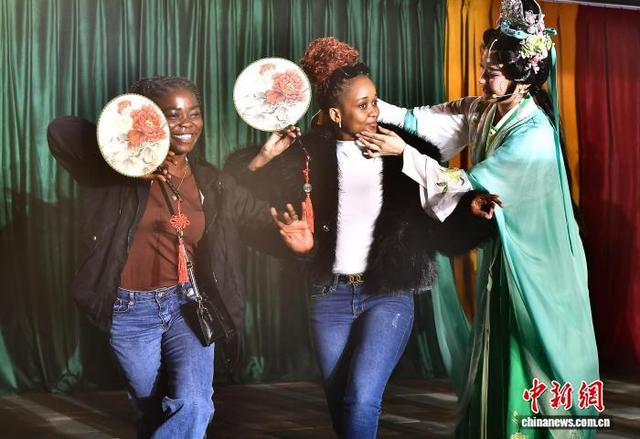 1月30日晚,留学生展示学习的闽剧表演动作。中新社记者 张斌 摄