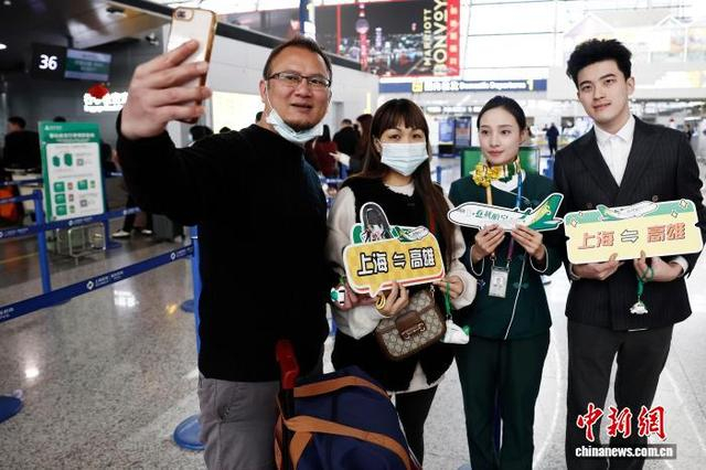 2月1日,在浦东国际机场T2航站楼内,春秋航空地面工作人员与旅客合影。当日,春秋航空恢复上海浦东至高雄的直飞航线,保障台胞春节返乡出行。中新社记者 殷立勤 摄
