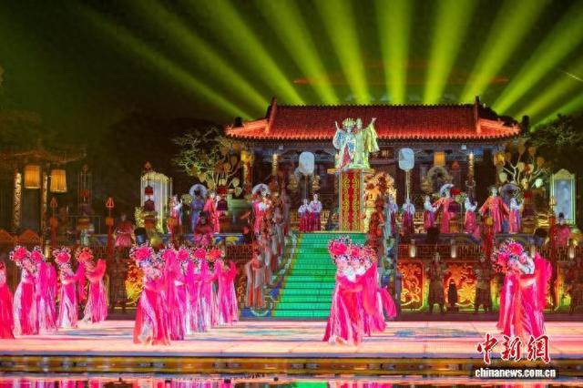 2月1日,陕西西安,2026年《长恨歌》在华清宫景区首演,并在视野、光影、舞台场景、舞蹈编排等方面进行了全新升级。图为杨贵妃出场。中新社记者 张远 摄