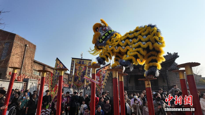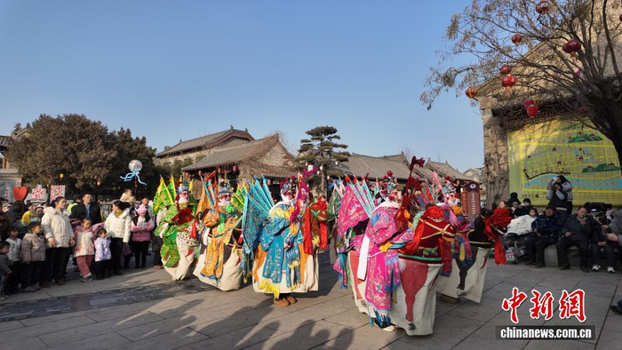 2月1日,参加2026年海峡两岸青年匹克球交流活动的台胞来到河南浚县。适逢新春佳节将至,大家沉浸式逛庙会、观社火、品美食、体验非遗制作,共同感受中原年味。图为社火表演。中新社记者 李超庆 摄