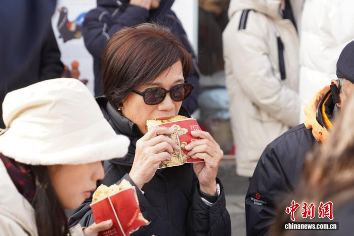 2月1日,参加2026年海峡两岸青年匹克球交流活动的台胞来到河南浚县。适逢新春佳节将至,大家沉浸式逛庙会、观社火、品美食、体验非遗制作,共同感受中原年味。图为台胞品尝浚县特色小吃。中新社记者 李超庆 摄