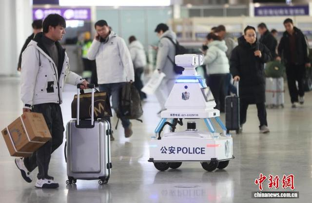 2月2日,2026年中国春运首日,南京铁路公安处南京南站派出所机器人“小安”在铁路南京南站候车大厅内巡逻。中新社记者 泱波 摄