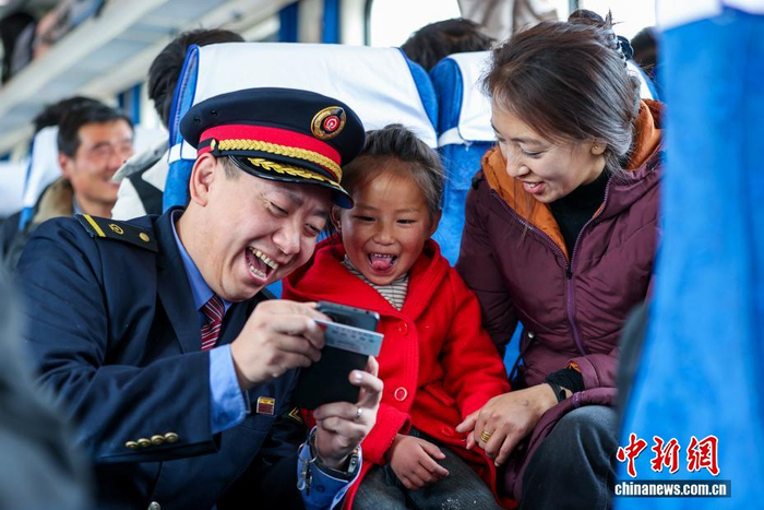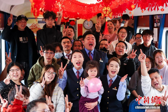 2月2日,为期40天的2026年春运正式启动。中国铁路青藏集团有限公司预计发送旅客205万人次,较去年春运增幅1.03%。图为列车工作人员与旅客合影留念。中新社记者 薛蒂 摄