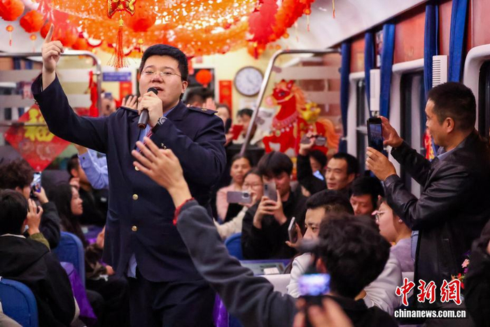 2月2日,为期40天的2026年春运正式启动。中国铁路青藏集团有限公司预计发送旅客205万人次,较去年春运增幅1.03%。图为拉萨至广州白云列车上,工作人员组织文艺表演,缓解旅客疲劳。中新社记者 薛蒂 摄