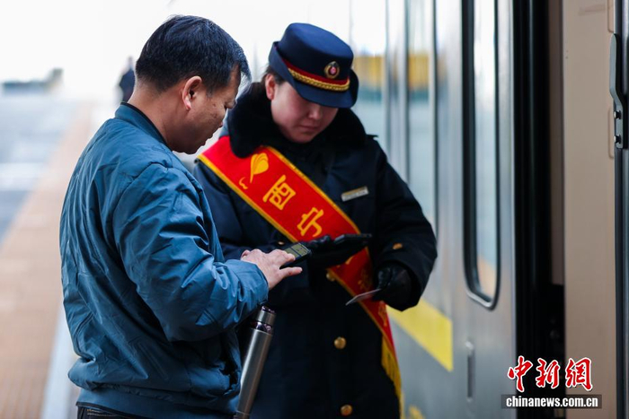 2月2日,为期40天的2026年春运正式启动。中国铁路青藏集团有限公司预计发送旅客205万人次,较去年春运增幅1.03%。图为列车工作人员(左一)查验旅客车票。中新社记者 薛蒂 摄