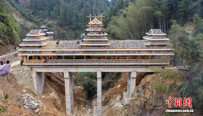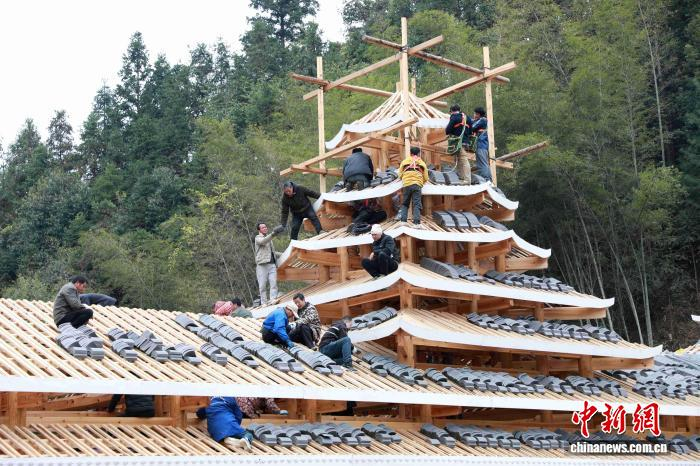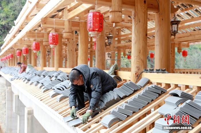 图为村民在为风雨桥盖瓦。龚普康 摄